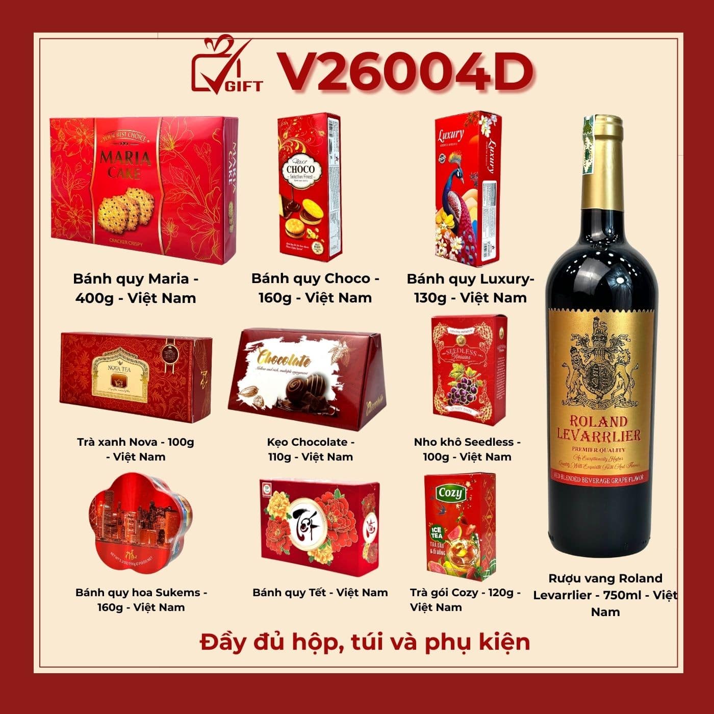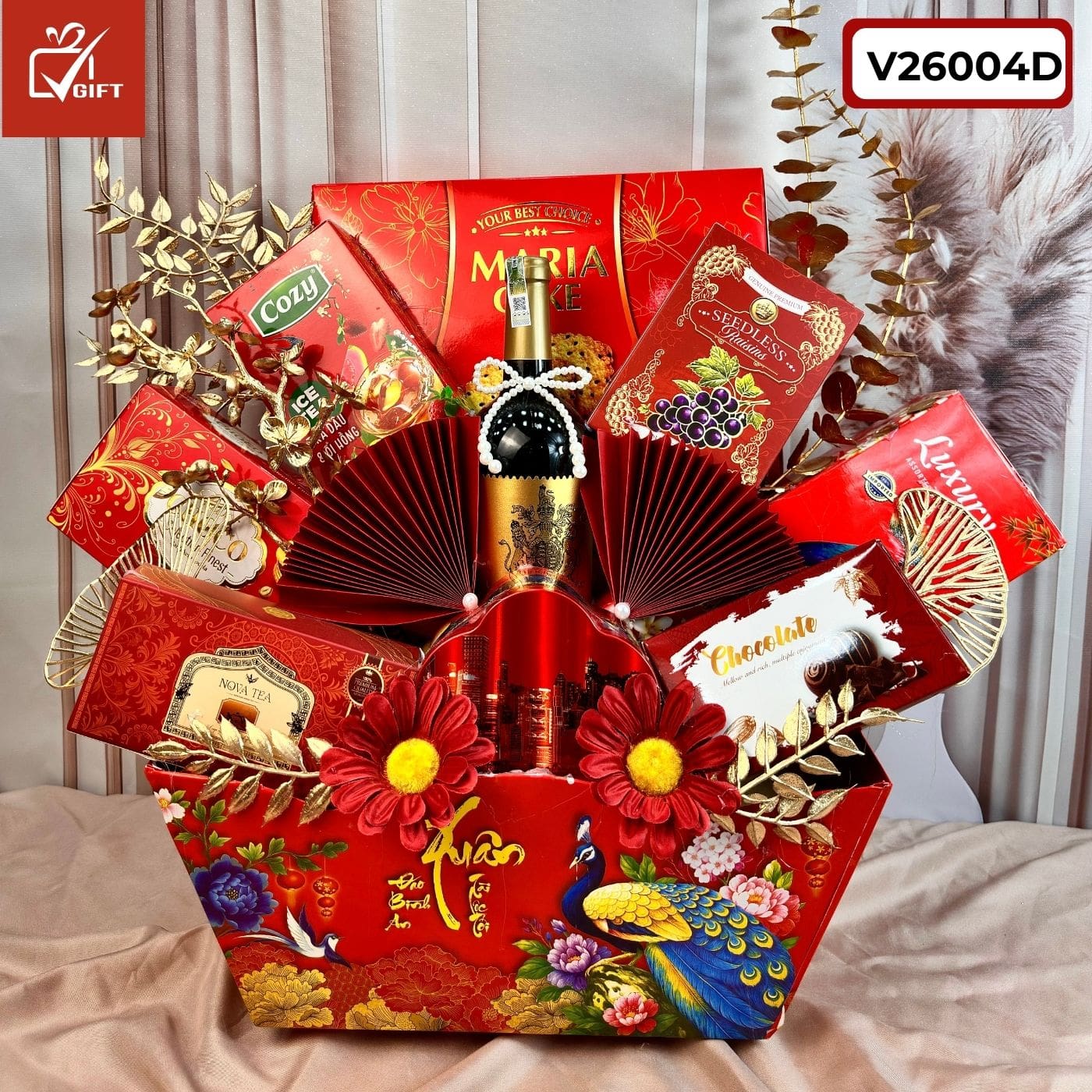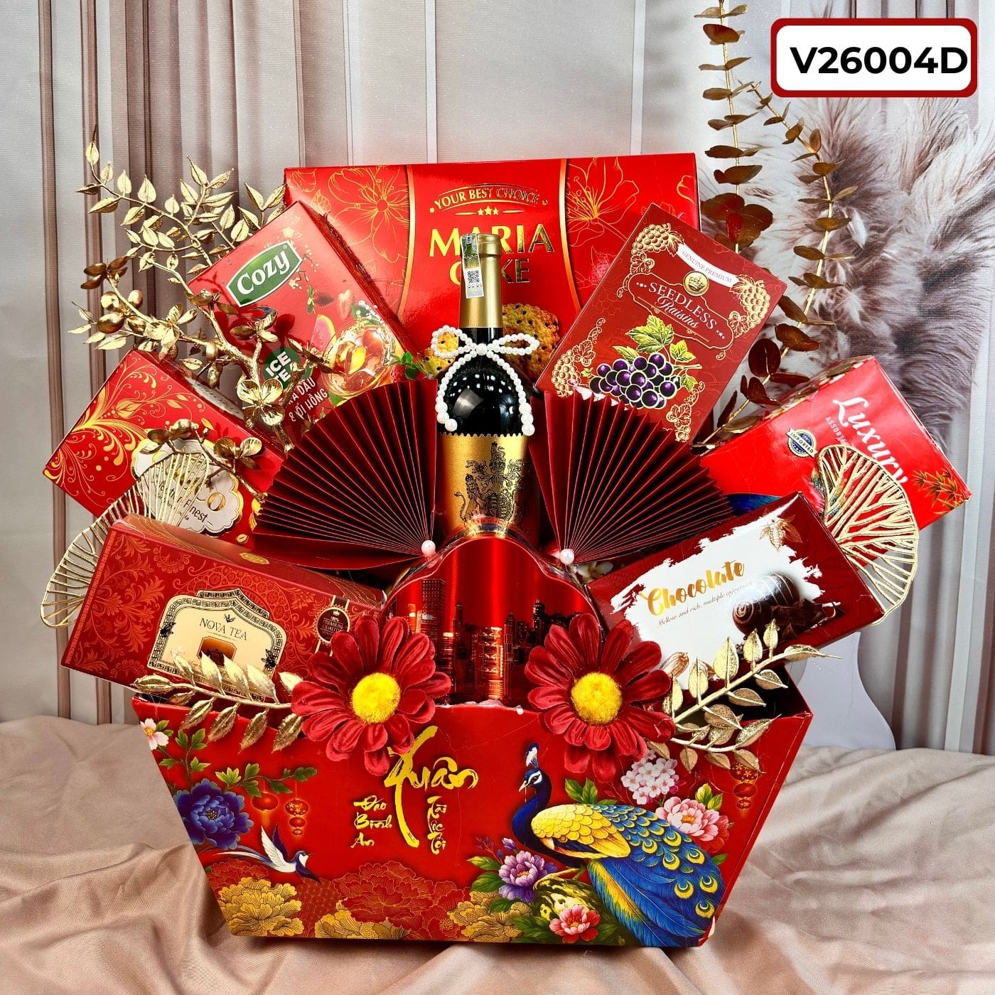 Giỏ quà Tết mã số V26004D là sự kết hợp hoàn hảo giữa nét đẹp truyền thống và sự sang trọng. Với sắc đỏ may mắn chủ đạo cùng thiết kế hình chim công cao quý, đây chính là món quà tuyệt vời để tri ân đối tác, khách hàng và những người thân yêu trong dịp Tết này. 🌸