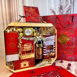 Thiết kế sang trọng: Giỏ quà được bày trí trong hộp gỗ bát giác độc đáo, đi kèm túi xách đỏ họa tiết cung đình rực rỡ, mang lại vẻ ngoài đẳng cấp và mang đậm không khí Tết. 🎊