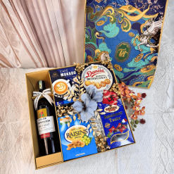 Hộp quà V26036X gây ấn tượng bởi thiết kế hình hộp vuông vức, hiện đại với tông màu xanh dương chủ đạo phối cùng họa tiết rồng phượng và sóng nước cách điệu. Đây là món quà hoàn hảo để biếu tặng đối tác và người thân, thể hiện sự chỉn chu và gu thẩm mỹ tinh tế của người tặng.