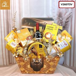 Nếu sắc xanh mang đến vẻ quý tộc thì sắc vàng kim của Set quà V26073V chính là biểu tượng của sự giàu sang, thịnh vượng và năng lượng tích cực. Với thiết kế tựa như ánh mặt trời rực rỡ ngày đầu xuân, giỏ quà này là lời chúc “Vạn sự như ý, đắc lộc đắc tài” gửi đến những người trân quý.