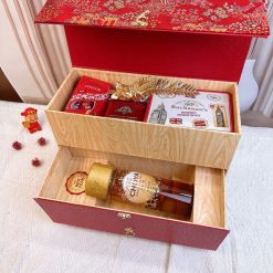Thiết kế hộp quà độc bản: Hộp gỗ cấu trúc 2 tầng (ngăn kéo) được bọc gấm đỏ thêu hoa văn cung đình sang trọng, có thể tái sử dụng để làm hộp đựng vật dụng cá nhân vô cùng thẩm mỹ.