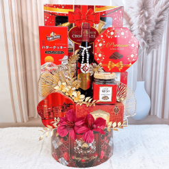 Giữa không khí rộn ràng của những ngày giáp Tết, giỏ quà V26099D hiện diện như một tác phẩm nghệ thuật đầy kiêu hãnh với sắc đỏ rực rỡ và ánh vàng kim quý phái. Được thiết kế theo dáng trụ đứng vững chãi, điểm xuyết bằng những đóa hoa mẫu đơn rực cháy và cành lá rẻ quạt dát vàng, đây chính là món quà thượng hạng để bạn gửi gắm lòng tri ân sâu sắc đến người thân và đối tác quan trọng.