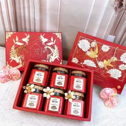 Hộp quà gây ấn tượng mạnh với sắc đỏ quyền quý – màu của may mắn và tài lộc. Họa tiết “Mã Đáo Thành Công” và những đóa hoa mẫu đơn nở rộ được ép kim tinh xảo, biểu trưng cho sự thăng tiến và hạnh phúc viên mãn. Mỗi set quà đều đi kèm túi xách đồng bộ và phụ kiện trang trí sang trọng, sẵn sàng để bạn mang đi biếu tặng mà không cần chuẩn bị thêm.
