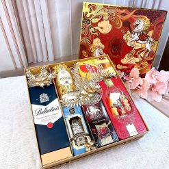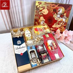 Hộp quà gây ấn tượng mạnh mẽ với sắc đỏ thắm đặc trưng của ngày Tết, kết hợp cùng các họa tiết ép kim tinh xảo. Bên trong, các sản phẩm được sắp xếp tinh tế, điểm xuyết bằng những nhành hoa lá mạ vàng sang trọng, tạo nên một tác phẩm nghệ thuật quà tặng đầy quý phái và lôi cuốn ngay từ cái nhìn đầu tiên.