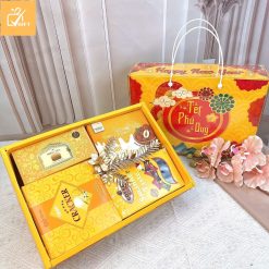Thiết kế sang trọng: Sản phẩm đi kèm hộp đựng cứng cáp và túi xách đồng bộ với họa tiết hoa văn truyền thống, chữ “Tết Phú Quý” nổi bật, mang lại cảm giác chỉn chu và cao cấp.