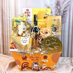 Mỗi giỏ quà đều được sắp xếp thủ công khéo léo, trang trí bằng hoa lụa vàng đồng điệu và các phụ kiện lá ánh kim lộng lẫy. Sản phẩm được cung cấp đầy đủ giỏ đựng, túi xách và các phụ kiện đi kèm, sẵn sàng trở thành sứ giả mang niềm vui và sự hưng thịnh đến mọi nhà.